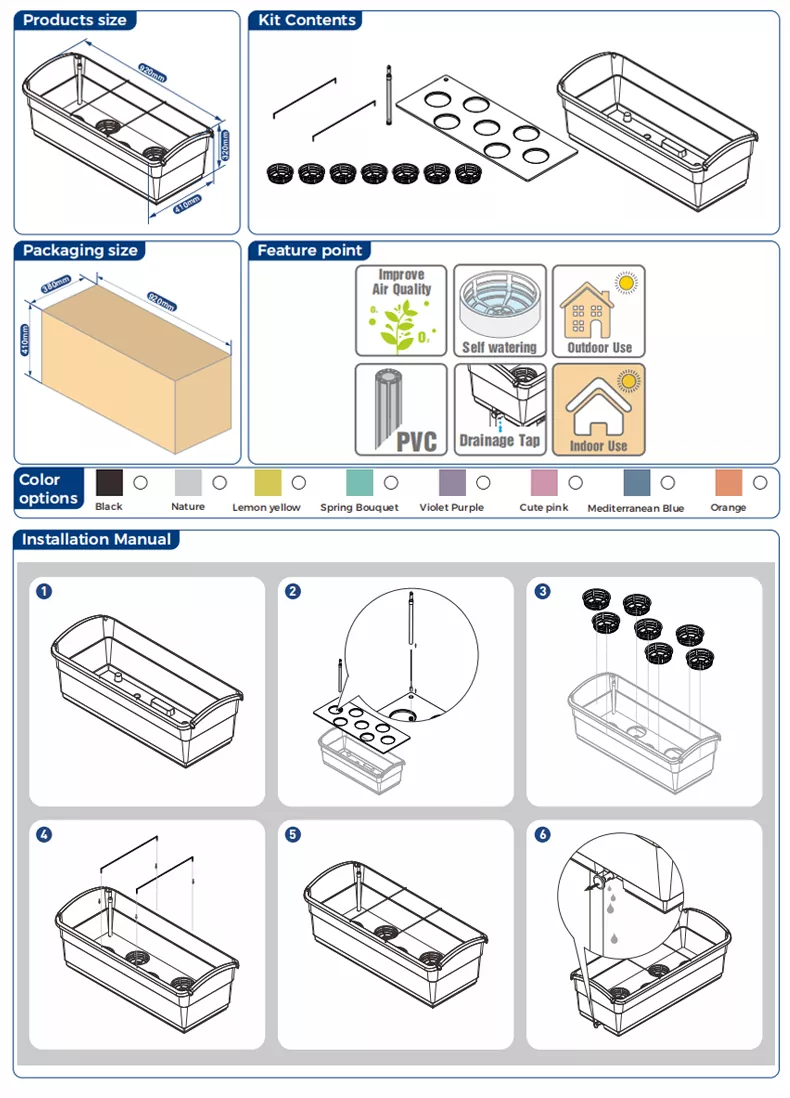 Máy bào tự tưới 30L này thích hợp để trồng rau, cây xanh và hoa. Máy được trang bị đồng hồ đo mực nước để theo dõi mực nước. Khi mực nước vượt quá giá trị tối đa, bạn cần xả hết nước ra khỏi chậu. Có van thoát nước bên hông chậu. Đẩy nó vào trong để đóng lại và kéo nó ra ngoài để thoát nước. Nồi này có thể được sử dụng cả trong nhà và ngoài trời. Khi sử dụng ngoài trời, bạn nhớ mở van thoát nước để tránh nước tích tụ trong chậu do mưa.