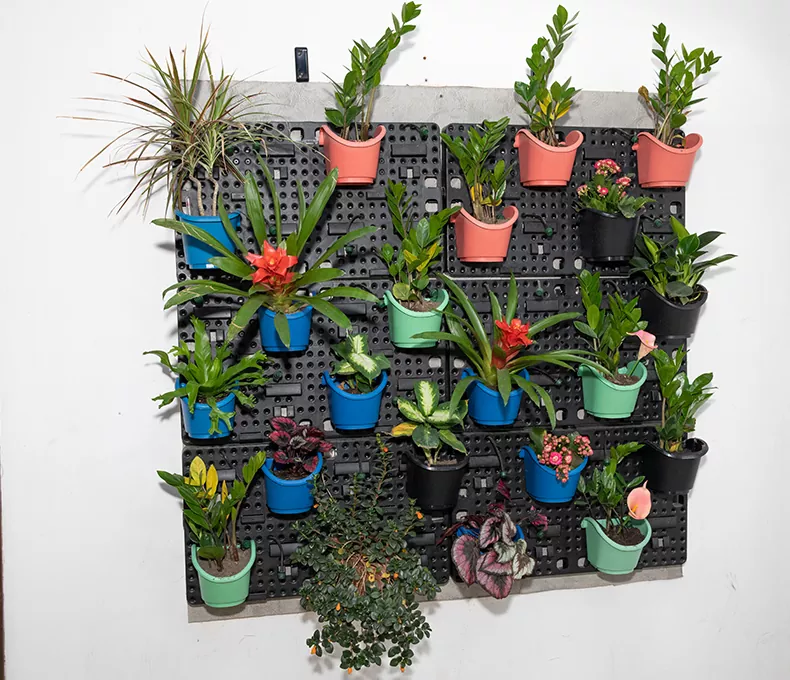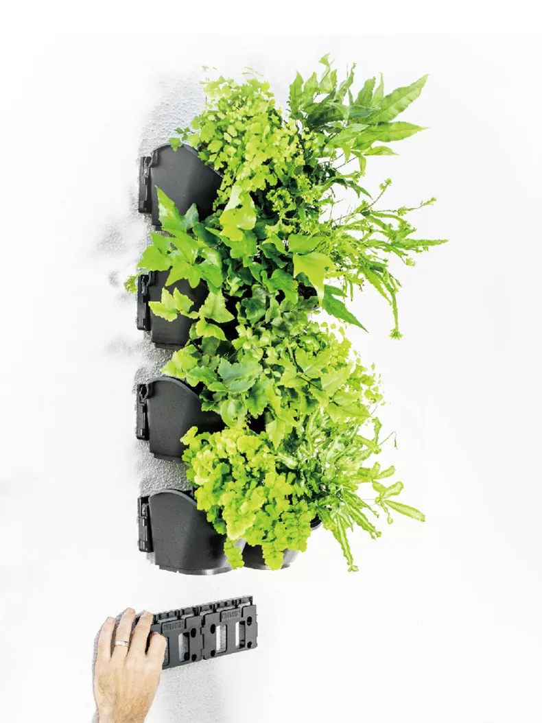 Chậu trồng cây tự tưới nước trong nhà này được sắp xếp với cả Giá đỡ vườn treo tường dọc Watex và Tường xanh di động bằng kim loại Watex.