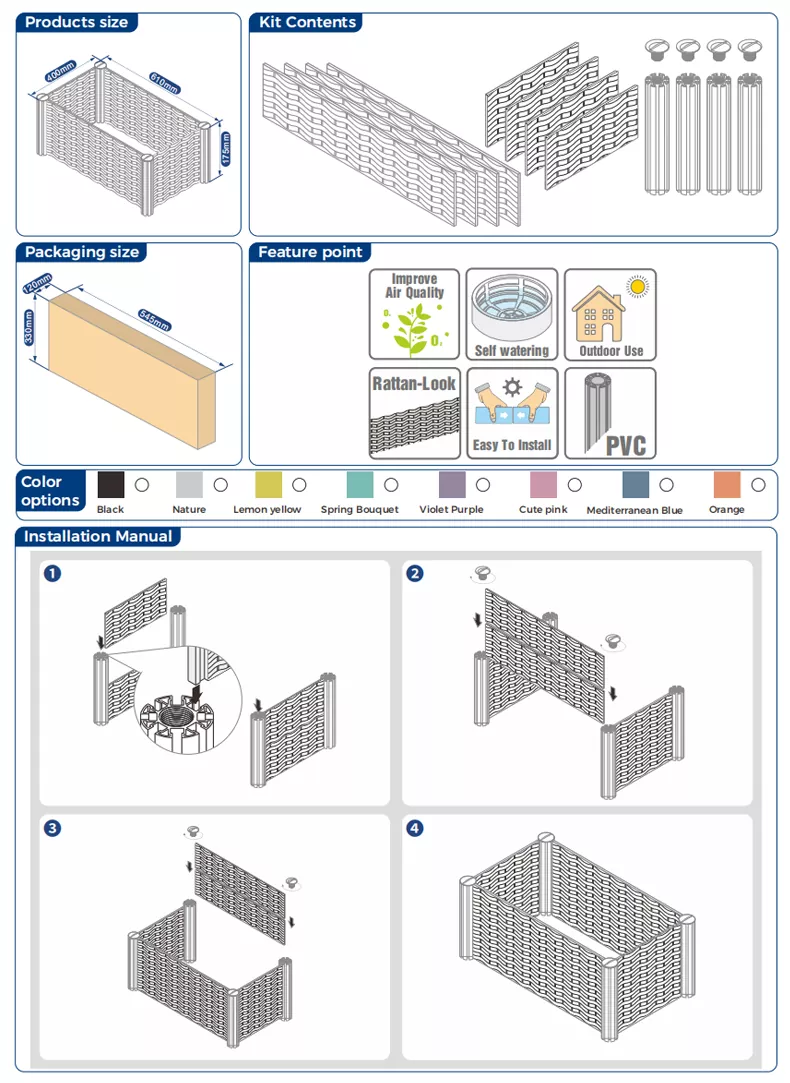 Mỗi chiếc giường sân vườn bằng nhựa bất tử hình chữ nhật đều có sách hướng dẫn lắp ráp minh họa chi tiết, đánh dấu rõ ràng các bước lắp đặt và lưu ý của từng bộ phận. Nếu bạn gặp bất kỳ câu hỏi nào trong quá trình lắp ráp, bạn có thể liên hệ với chúng tôi bất cứ lúc nào thông qua dịch vụ khách hàng trực tuyến, đường dây nóng chính thức hoặc các kênh khác, chúng tôi sẽ cung cấp hướng dẫn trực tiếp bằng video hoặc văn bản để đảm bảo bạn hoàn tất quá trình cài đặt một cách suôn sẻ.