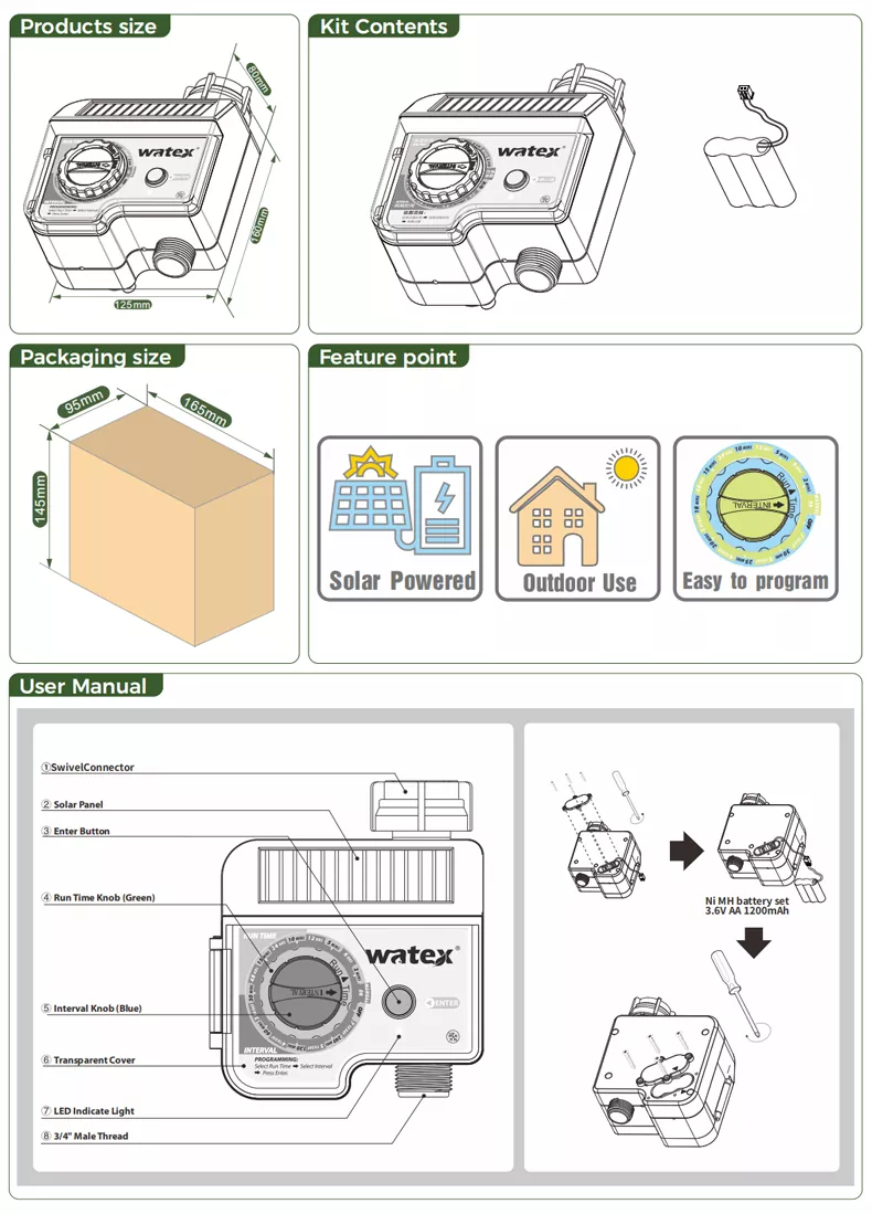 So với các sản phẩm tương tự, bộ hẹn giờ sử dụng năng lượng mặt trời không cần phải thay pin thường xuyên (trong điều kiện sử dụng bình thường). Nó thân thiện với môi trường và tiết kiệm năng lượng. Nó có đủ năng lượng và bền bỉ, khiến nó trở thành một thiết bị tưới nước giúp bạn yên tâm đi công tác.