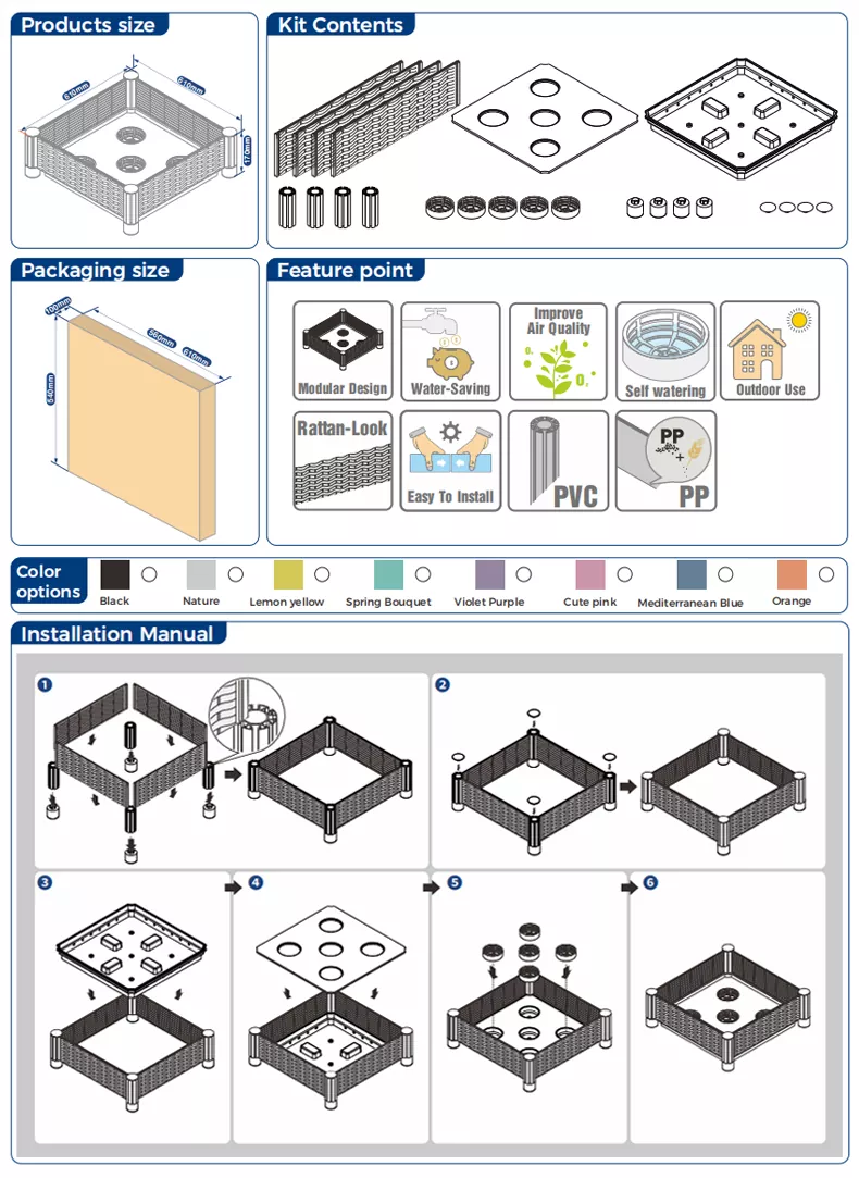 Watex là nhà sản xuất giường vườn nhựa chuyên nghiệp, chúng tôi xin cung cấp cho bạn giường vườn nhựa giả mây vuông. Và chúng tôi sẽ cung cấp cho bạn dịch vụ sau bán hàng tốt nhất và giao hàng kịp thời. Chúng tôi rất mong nhận được phản hồi của bạn.
