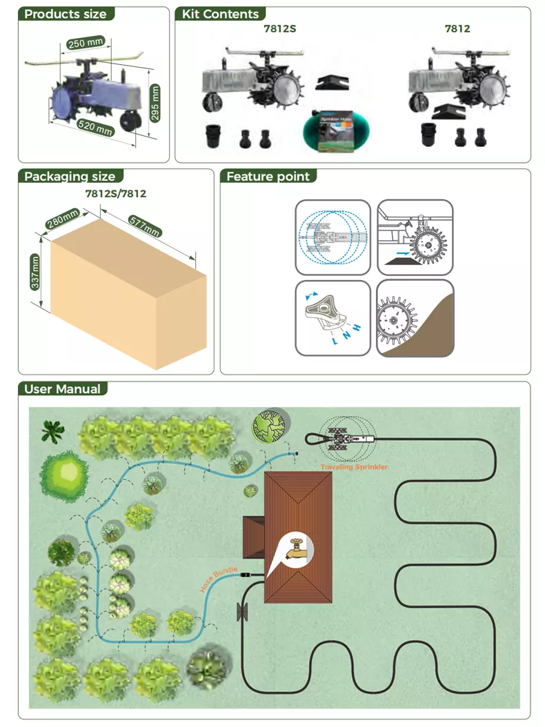 Là một bánh xe nước tự hành, Traveling Sprinkler hoàn toàn không phụ thuộc vào điện hoặc pin và được điều khiển bởi áp lực của nước máy để di chuyển và phun nước, điều này không chỉ giúp loại bỏ những rắc rối khi sạc hoặc thay pin mà còn đạt được hiệu quả bảo tồn năng lượng và bảo vệ môi trường từ nguồn. Về lâu dài, nó cũng có thể giảm chi phí tiêu thụ năng lượng bổ sung, phù hợp với khái niệm sống xanh.